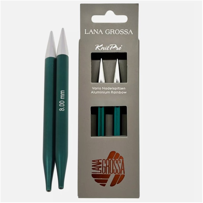 Vymeniteľné ihlicové špičky Lana Grossa Vario Rainbow sú skvelou voľbou pre každého, kto chce mať vo svojej výbave flexibilný a estetický nástroj na pletenie. Vyrobené z ľahkého a pevného eloxovaného hliníka, vynikajú hladkým povrchom, elegantným dizajnom a praktickým farebným rozlíšením podľa veľkosti.